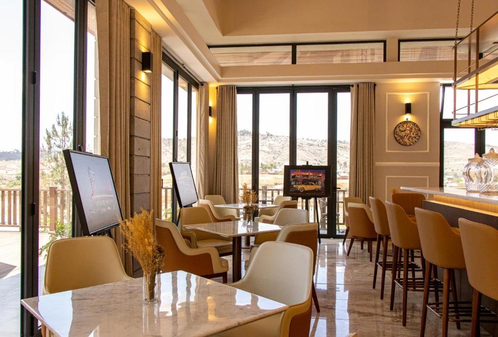 Elegant Accommodation: Golf du Rova Luxury Hotel in Antananarivo offers a 5-star experience with spa facilities, a saltwater swimming pool, sauna, fitness centre, sun terrace, and lush gardens. Guests enjoy free WiFi, a restaurant, bar, and private check-in and check-out services. Comfortable Amenities: Rooms feature air-conditioning, private bathrooms, tea and coffee makers, minibars, and balconies with lake or mountain views. Additional amenities include a fitness centre, yoga classes, and free on-site parking. Dining Options: The family-friendly restaurant serves Asian and international cuisines with brunch, lunch, dinner, high tea, and cocktails. Breakfast includes local specialities, fresh pastries, and vegetarian options. Prime Location: Located 8 km from Ivato International Airport, the hotel is near attractions such as Tsarasaotra Park (18 km) and Lemur Park (41 km).