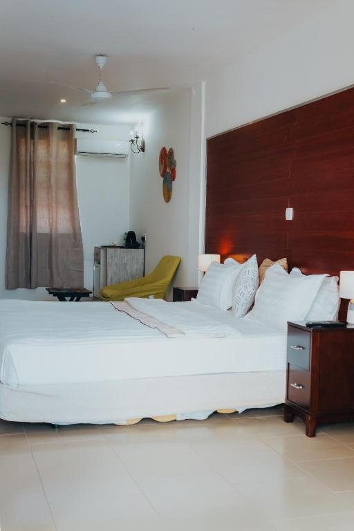 Beachfront Location: Harmony Resort Boutique Hotel in Banjul offers direct beachfront access and stunning sea views. Guests can relax by the swimming pool with a view or unwind in the lush garden. Comfortable Accommodations: Rooms feature air-conditioning, private bathrooms, balconies, and modern amenities. Family rooms and interconnected rooms cater to all travellers, ensuring a comfortable stay. Dining Experience: The family-friendly restaurant serves African, Chinese, British, and international cuisines. Breakfast options include continental, American, and full English/Irish, accommodating various dietary needs. Convenient Services: Guests benefit from free WiFi, a paid shuttle service, and a 24-hour front desk. Additional services include room service, daily housekeeping, and a pool bar. Nearby Attractions: Bijilo Beach is a 3-minute walk away, while Bijilo Forest Reserve lies 3.5 km from the hotel. Other attractions include Abuko Nature Reserve (17 km) and Gambia National Museum (22 km). Banjul International Airport is 12 km distant.