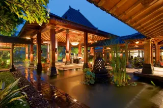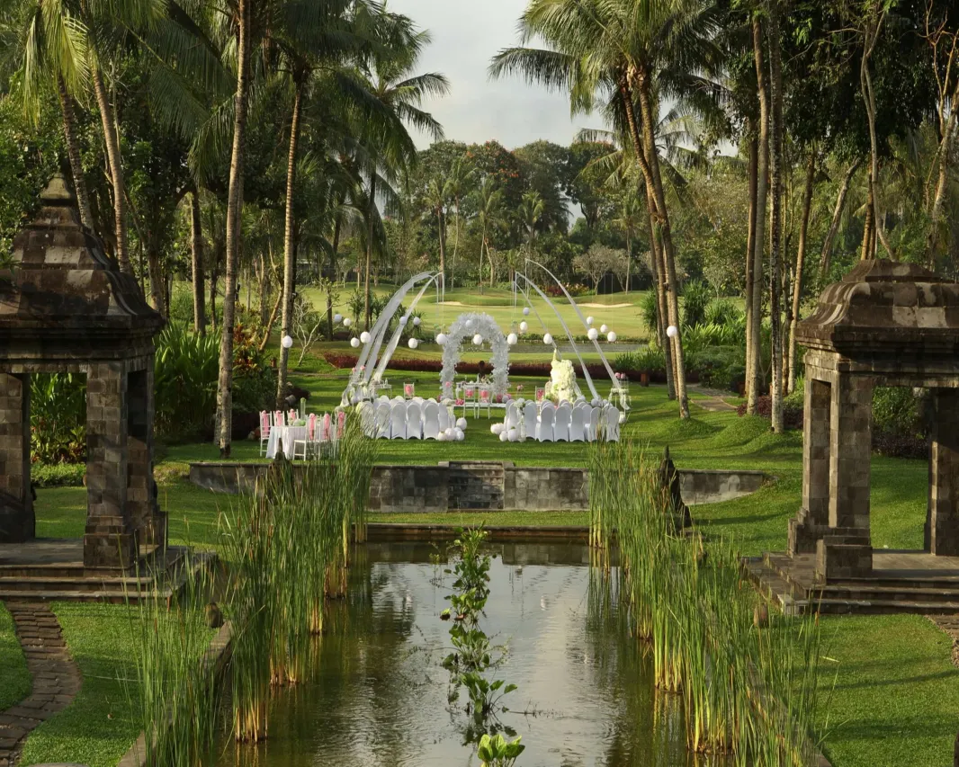 A 269 room deluxe resort on the outskirts of the city Yogyakarta /jhok-jhaa karta/, with convenient access to Borobudur, the world renowned Buddhist monument. This resort is surrounded by landscaped gardens, and a 9 hole golf course and driving range. The hotel includes a multi-level free form pool with water slides, water fall, children's pool, gym, tennis court, Sunday yoga and jogging track