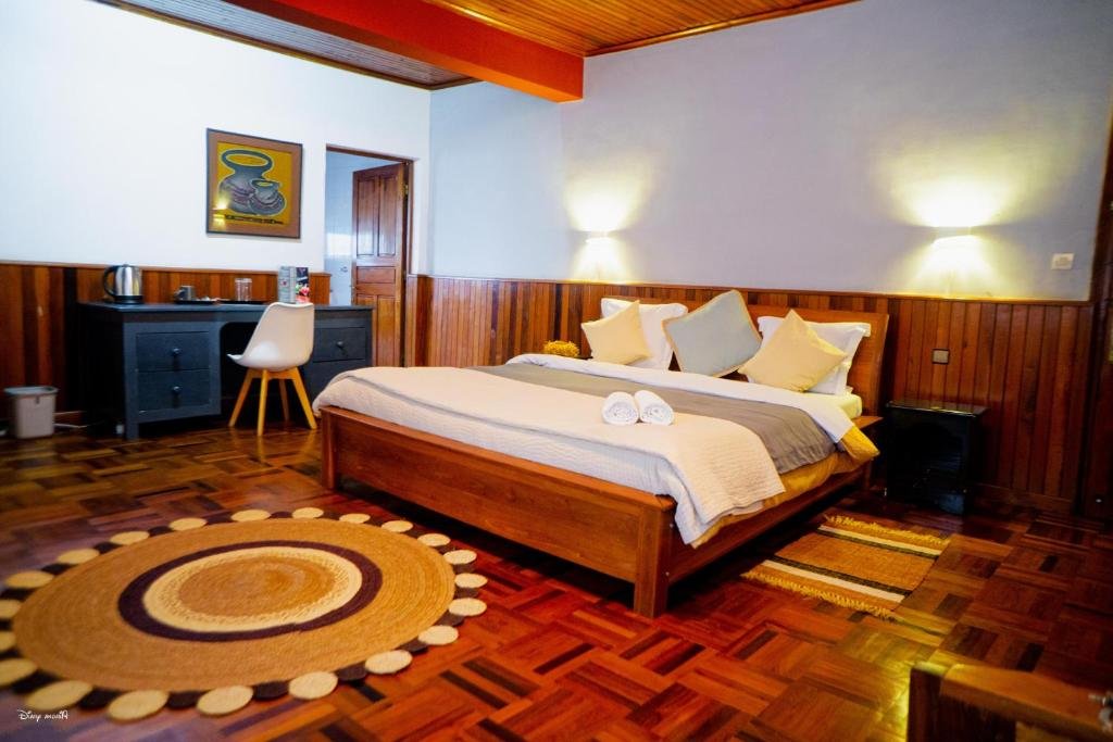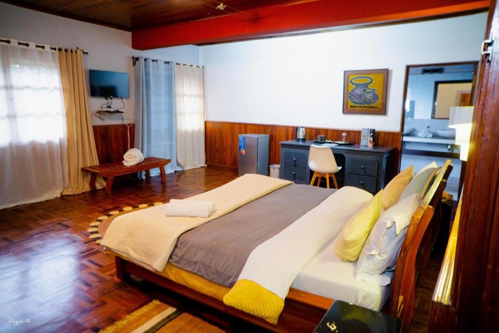 Comfortable Accommodations: L'anis Etoilé - Hôtel Restaurant in Antsirabe offers spacious rooms with private bathrooms, balconies, and garden views. Each room includes a TV, parquet floors, and free WiFi. Dining and Leisure: Guests can enjoy a sun terrace, garden, restaurant, and bar. The on-site restaurant serves continental, American, vegetarian, halal, and à la carte breakfasts with fresh pastries, fruits, and warm dishes. Additional facilities include a coffee shop, outdoor seating area, and free private parking. Convenient Location: Located 182 km from Ivato International Airport, the property is a 4-minute walk from Antsirabe Train Station and near attractions such as Fahaleovantena Tribes Monument (400 metres) and Cathedral Antsirabe (13-minute walk). Free on-site private parking is available.