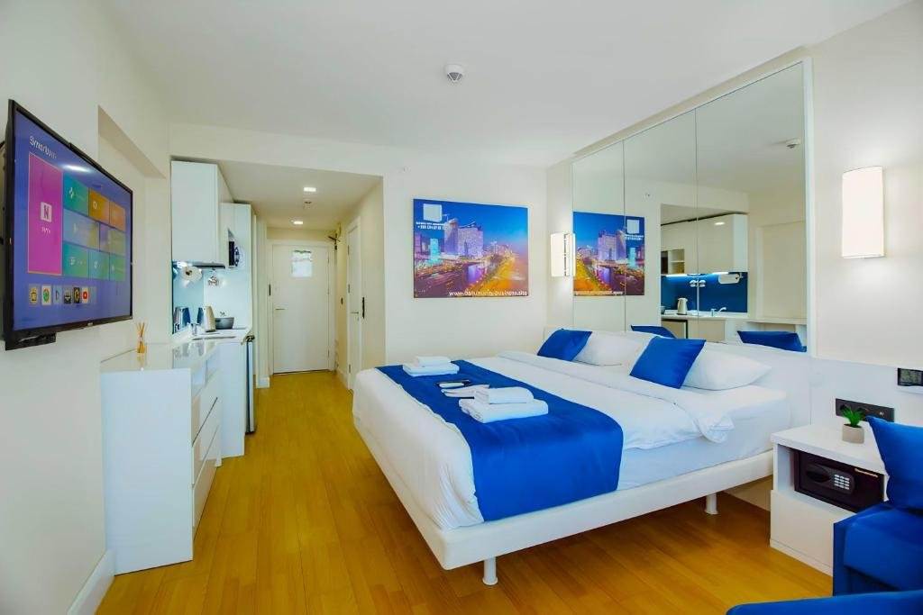 Prime Beachfront Location: PANORAMA Luxury Hotel Batumi in Batumi offers a private beach area and beachfront access. Guests can relax on the sun terrace and enjoy stunning sea views. Free WiFi is available throughout the property. Comfortable Accommodations: Rooms feature air-conditioning, balconies, and private bathrooms. Additional amenities include bathrobes, flat-screen TVs, and modern kitchenettes. Family rooms and interconnected rooms cater to all guest needs. Exceptional Facilities: The hotel provides a casino, lounge, beauty services, and an indoor play area. Free off-site parking, a minimarket, and a coffee shop enhance the stay. Batumi International Airport is 4 km away. Nearby attractions include Batumi Beach and Aquapark Batumi.