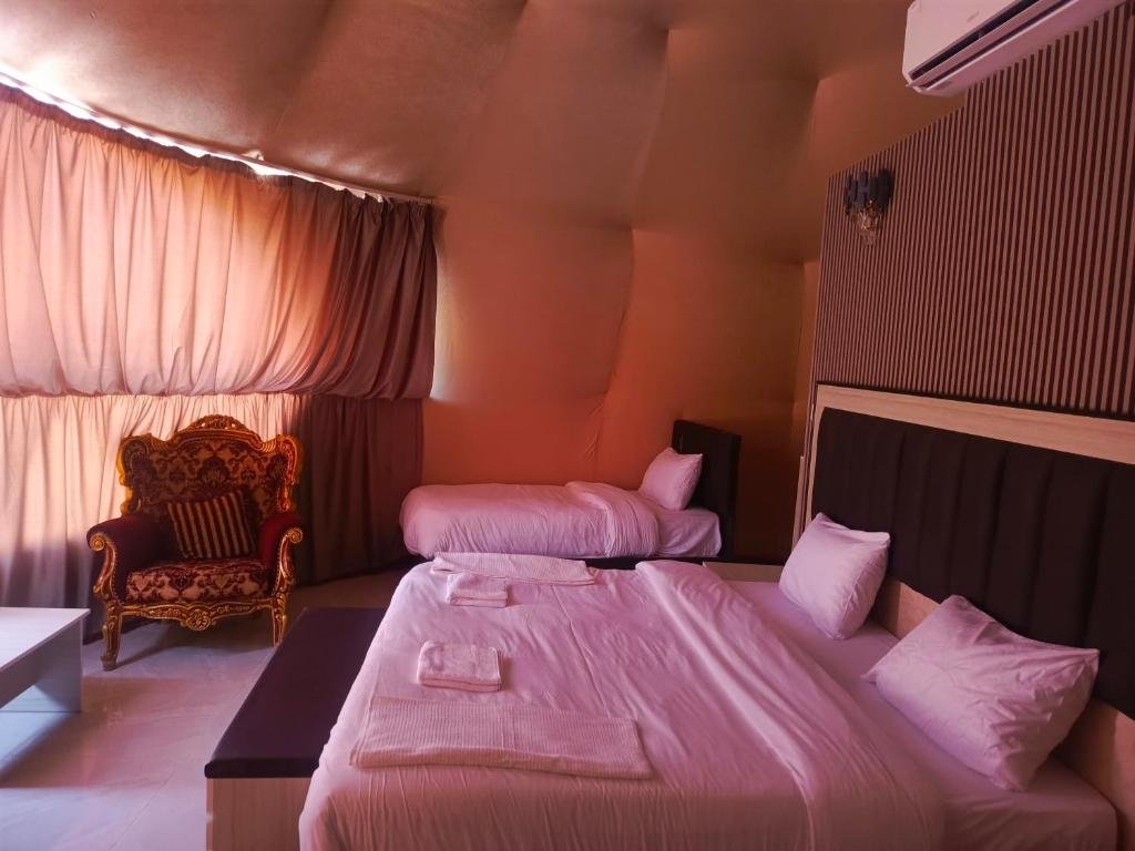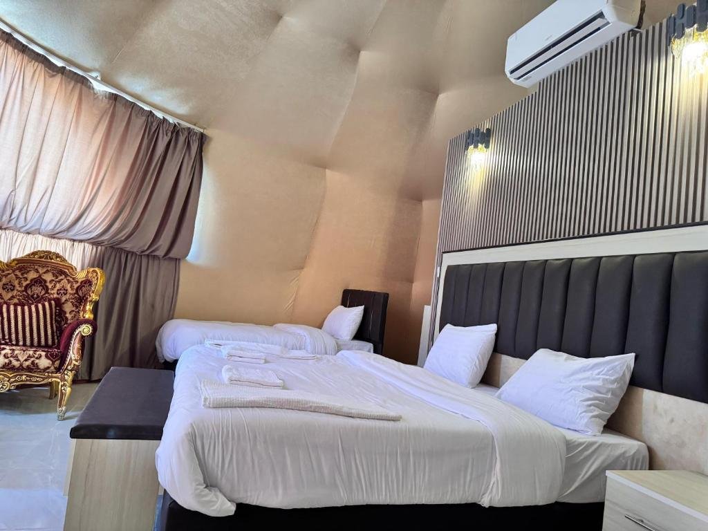 Comfortable Accommodations: Wadi Rum Marcanã camp in Aqaba offers family rooms with balconies, private bathrooms, and mountain views. Each room includes air-conditioning, a work desk, and free toiletries. Exceptional Facilities: Guests enjoy a sun terrace, garden, restaurant, and free WiFi in public areas. Additional amenities include a lounge, nightclub, and outdoor seating. Dining Experience: The family-friendly restaurant serves Middle Eastern and local cuisines with halal, vegetarian, and vegan options. Breakfast includes local specialities and cheese. Convenient Location: Located 69 km from King Hussein International Airport, the hotel is highly rated for its convenient location.