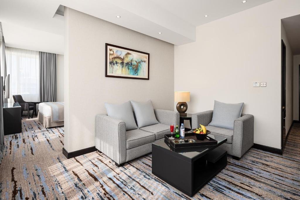 Cristal Hotel Abu Dhabi is a modern 4-star hotel located in the heart of the city's business district, right next to Madinat Zayed Shopping Center. Offering stylish accommodations with complimentary high-speed internet, the hotel ensures a comfortable stay for business and leisure travelers alike. Each spacious, air-conditioned room features elegant décor with warm tones and dark wooden furnishings. Guests can enjoy modern amenities such as a flat-screen satellite TV, minibar, and tea and coffee-making facilities. Dining options at Cristal Hotel cater to every taste. Viewz Restaurant serves an array of international cuisines, available as a buffet or à la carte. Blendz Lobby Café offers freshly brewed coffee, teas, light snacks, and pastries. Guests looking for entertainment can visit On Seventeen Bar, a sophisticated venue for drinks and socializing. For a unique dining experience, the Korean Restaurant & Karaoke Rooms on the Mezzanine Floor provide authentic Korean flavors and private karaoke spaces for fun-filled evenings. The hotel’s Figure 8 Health Club is fully equipped with a state-of-the-art gym, an indoor swimming pool, and steam and sauna rooms. Massage treatments and a beauty salon are also available for relaxation and wellness. Cristal Hotel’s prime location places guests within 5 minutes of Abu Dhabi’s major shopping and leisure destinations. The hotel offers complimentary valet parking and a 24-hour reception for added convenience. Whether you're visiting for business or leisure, Cristal Hotel Abu Dhabi promises a comfortable, stylish, and well-connected stay in the heart of the city.