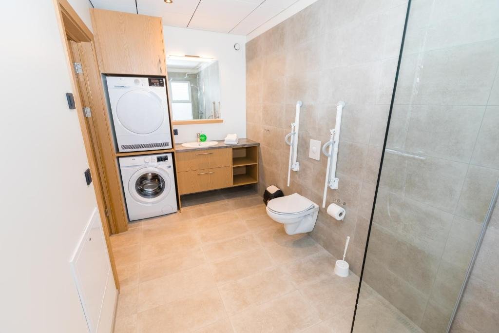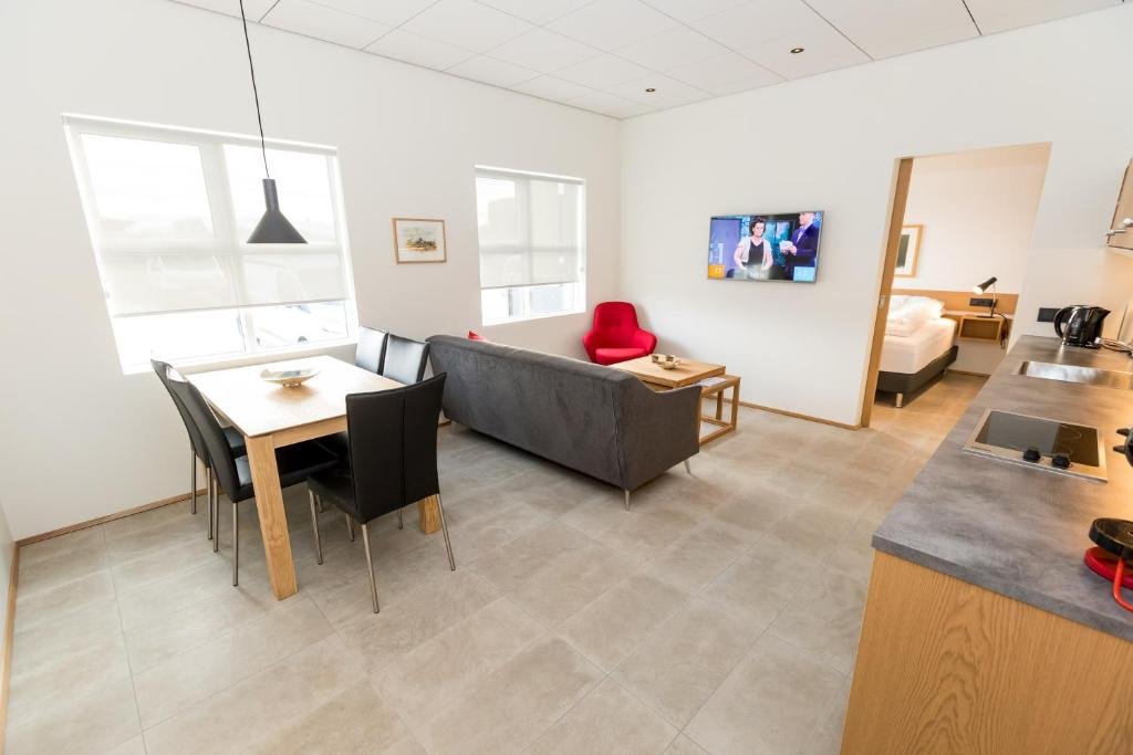 Comfortable Accommodations: Hrimland Apartments in Akureyri offers comfortable aparthotel rooms with private bathrooms, fully equipped kitchens, and balconies. Each room includes a washing machine, dishwasher, and free WiFi. Convenient Facilities: Guests benefit from free on-site parking, a lift, and ski storage. Additional amenities include a dining area, sofa, and soundproofing, ensuring a pleasant stay. Prime Location: Located 2 km from Akureyri Airport, the aparthotel is a 5-minute walk from Hof - Cultural Center and Conference Hall. Godafoss Waterfall is 35 km away. Highly rated for its convenient location, room cleanliness, and comfort.