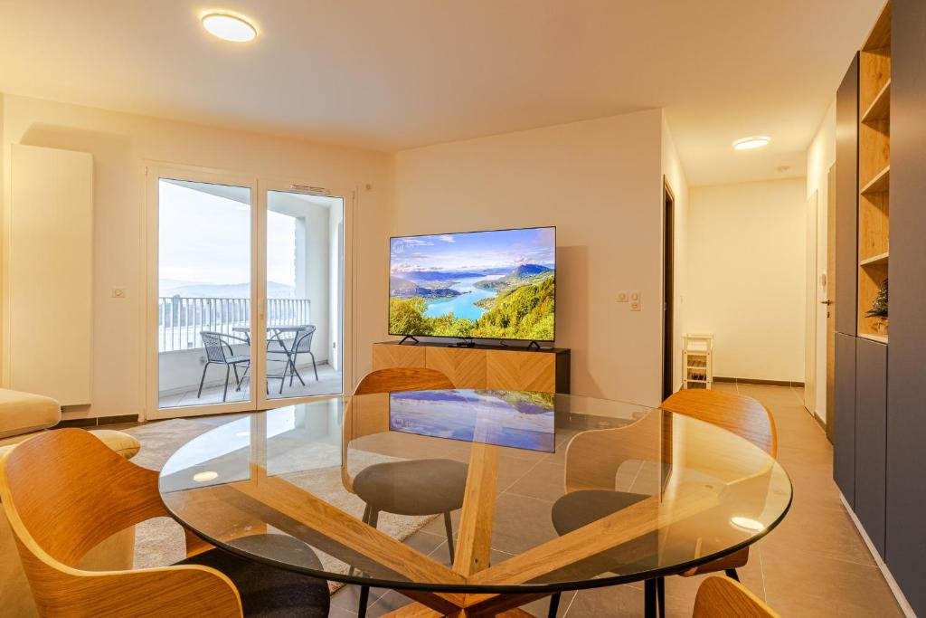 Comfortable Living Space: Le Petit Paradis vue lac in Annecy offers a one-bedroom apartment with a living room. Guests enjoy a balcony with lake and mountain views, a fully equipped kitchen, and a washing machine. Modern Amenities: The apartment features free WiFi, a lift, and free off-site private parking. Additional amenities include a dining table, sofa bed, TV, and a hairdryer. Convenient Location: Located 36 km from Rochexpo and Bourget Lake, 42 km from Chambéry-Savoie Airport, and 45 km from Stade de Genève and Jet d'Eau. Nearby attractions include an ice-skating rink, winter sports, boating, and scuba diving. Highly Rated by Guests: Guests appreciate the comfortable accommodations and excellent facilities, making it a highly rated choice.
