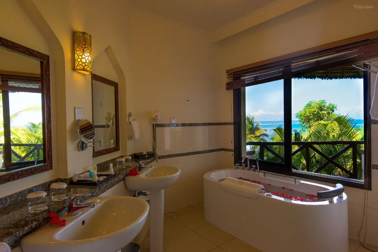 The 120 room luxury resort is situated on a cliff overlooking the Indian Ocean in Mangapwani and offers panoramic views from the lounge restaurant bar and recreational areas -- Both infinity swimming pools have wonderful views of the ocean - There is also a jetty bar that offers the perfect place from which to enjoy a sundowner or you could sail on our dhow and watch the beautiful sunsets that the West coast of Zanzibar is famous for -- 96 of our rooms offer views from the bedrooms and private balconies with all the modern facilities that you expect from an international hotel with complimentary Wi-Fi throughout the property -- The resort offers a number of activities for the energetic including a fully equipped gym - two tennis courts - a volleyball court - a squash court and bicycles for rides through the coconut plantation -- There is also a water sports centre offering a wide range of activities including water skiing - sailing and more. All non-motorized water sports are free to hotel guests -- For guests wanting to relax and be pampered we have the Shwari Spa with five treatment rooms offering a range of treatments including manicures pedicures facials and massages -- The spa has two steam rooms and saunas so you can truly enjoy your spa experience -- The resort also has a full time childrens centre supervised by professional child minders offering arts and crafts to name a few -- We have a designer golf course right on our property alongside the beach -- Our spectacular course consists of 9 holes 18 tees a driving range as well as a putting green -- The resorts convenient location makes it the perfect base from which to explore the world heritage site of Stone Town.
