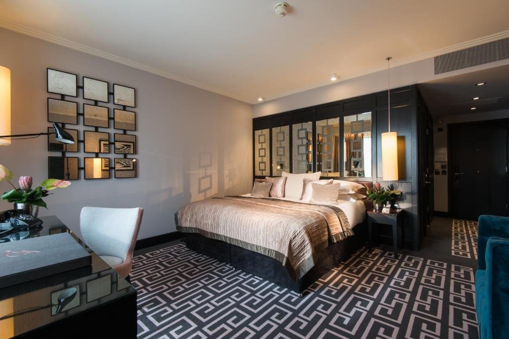 On Great Victoria Street, beside the Grand Opera House, the luxury Fitzwilliam Hotel Belfast offers boutique bedrooms with free Wi-Fi. There is a chic restaurant and modern cocktail bar. Valet parking is available for an additional cost. The sumptuous rooms have crisp Egyptian linens, and the elegant bathrooms feature fluffy robes and designer toiletries. All rooms have an LCD TV, air conditioning and a minibar. Fitzwilliam Restaurant serves fine wines and a creative menu in intimate surroundings. The stylish bar offers cocktails and champagnes in real crystal glasses, and boasts over 700 quality spirits. The impressive hotel features designer interiors, modern artwork and colourful furnishings throughout. Guests can relax in the luxury lounge areas, and there is also a 24-hour front desk. The unique Fitzwilliam Hotel Belfast is a 5-minute walk from Belfast Grand Central Station. Castle Court Shopping Centre is just half a mile away. please note that an extra charge of £40.00 per dog, per stay applies. Dogs are welcome in our Executive King rooms.
